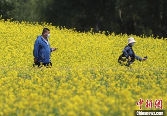 5月17日,在沈陽一公園內,占地面積2萬余平方米的油菜花競相綻放,吸引眾多市民前來觀賞。