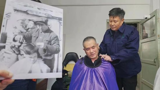披好剪發(fā)圍布,插上電。黨員服務(wù)隊隊員張迪抱著當年的印有“為人民服務(wù)”的方鏡,坐在二位老人面前。
