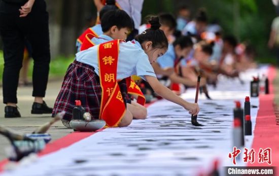 7月27日,以“光輝的篇章 不朽的豐碑”為主題的抗美援朝戰爭勝利70周年紀念活動在沈陽抗美援朝烈士陵園舉辦。圖為學生們在百米長卷上書寫偉大抗美援朝精神,向英雄們表達心中的敬意。中新社記者 于海洋 攝