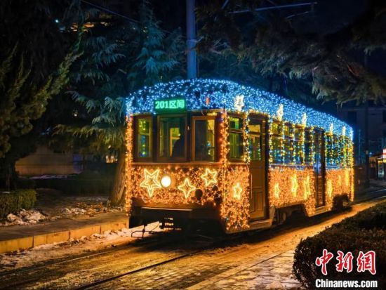中新網大連12月29日電(記者 楊毅)當百年有軌電車披上“光影外衣”會是什么樣?29日晚,由大連市文化和旅游局、大連公共交通建設投資集團有限公司、大連博濤文化聯合打造的光影電車、光影雙層巴士,開啟試運行,吸引不少市民和游客爭相“打卡”。